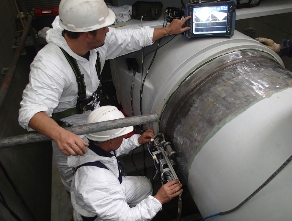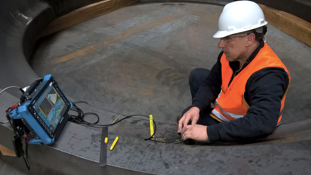 - Controllo della saldature tra bocchelli e mantelli o fondi nei pressure vessels con scansioni manuali guidate.